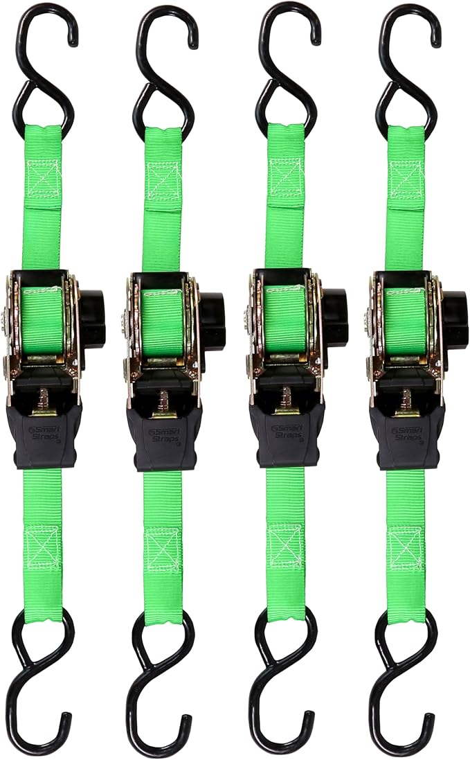 - GREEN MEANS STANDARD DUTY: Strong, non-marring coated steel S-hooks with a break strength of 1,500lbs. This 4 pack of 6-foot long self-retracting ratchet straps have a safe work load of 500lbs each, keep your cargo secure during transport.